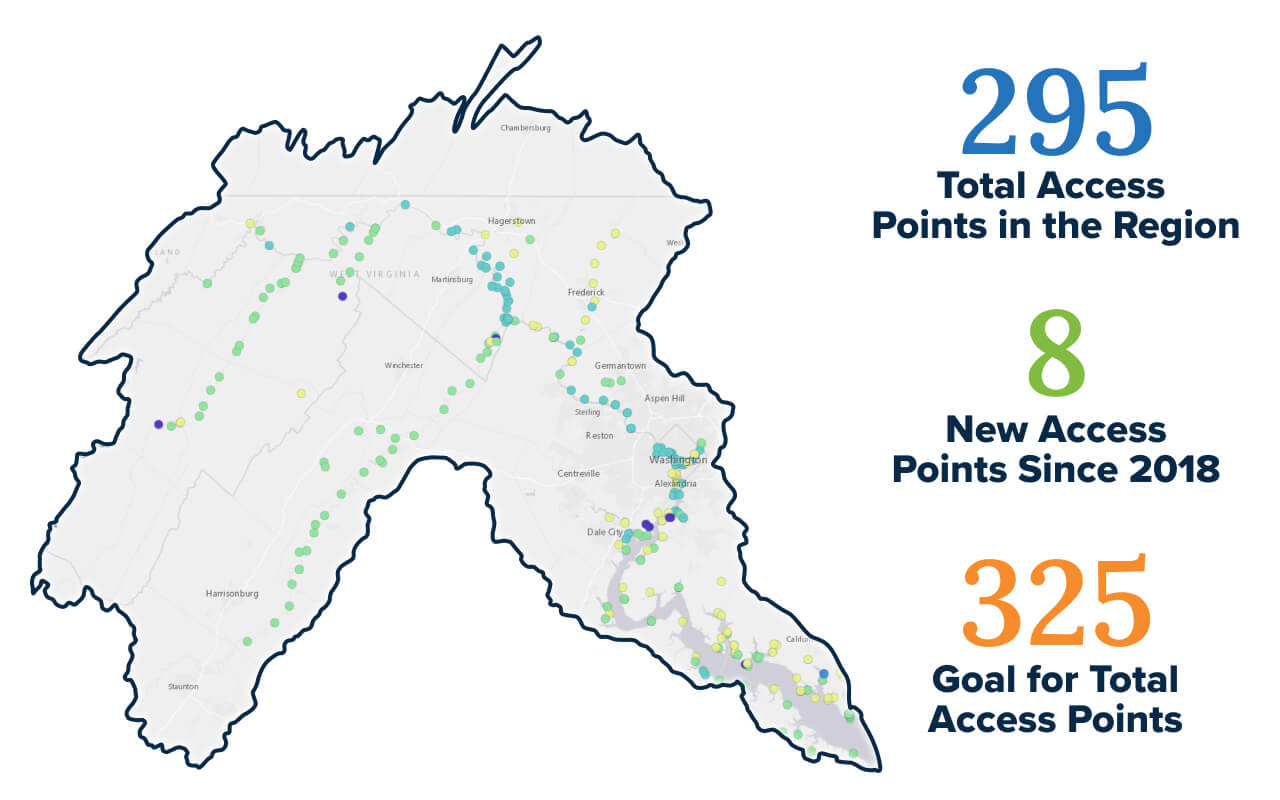 Increased river access reflects improving water conditions and also demonstrates the Potomac’s value to the health and well-being of our community. The EPA has set a goal in its Chesapeake Bay Watershed Agreement of adding 300 new public access points by 2025. Expanding upon this goal, Potomac Conservancy has set a goal of achieving 325 public access points in the same timeframe. As of December 2020, the Potomac River watershed is meeting 90 percent of our public access point goal. A total of six access points were added in the Potomac region in 2020 alone, a dramatic increase from just one in 2019.